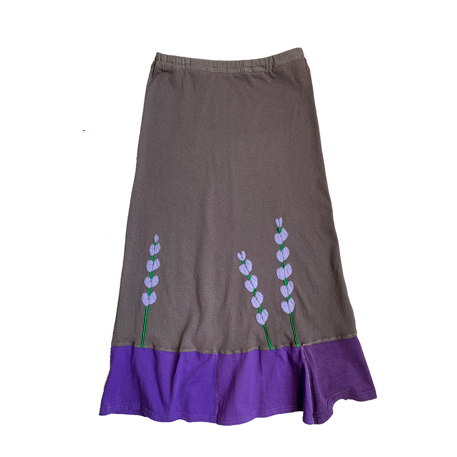 Long Skirts are made with high quality, up-cycled t-shirts. Freestyle sewn images are appliquéd on panels of various colors making each skirt unique and interesting.