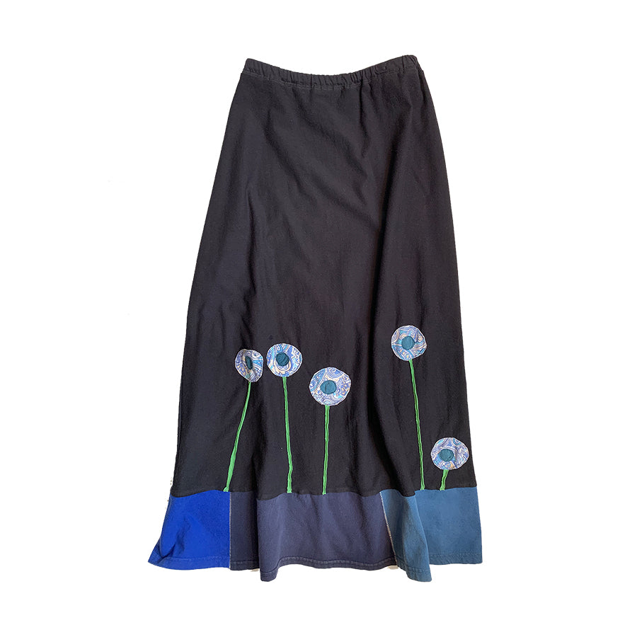 Long Skirts are made with high quality, up-cycled t-shirts. Freestyle sewn images are appliquéd on panels of various colors making each skirt unique and interesting.