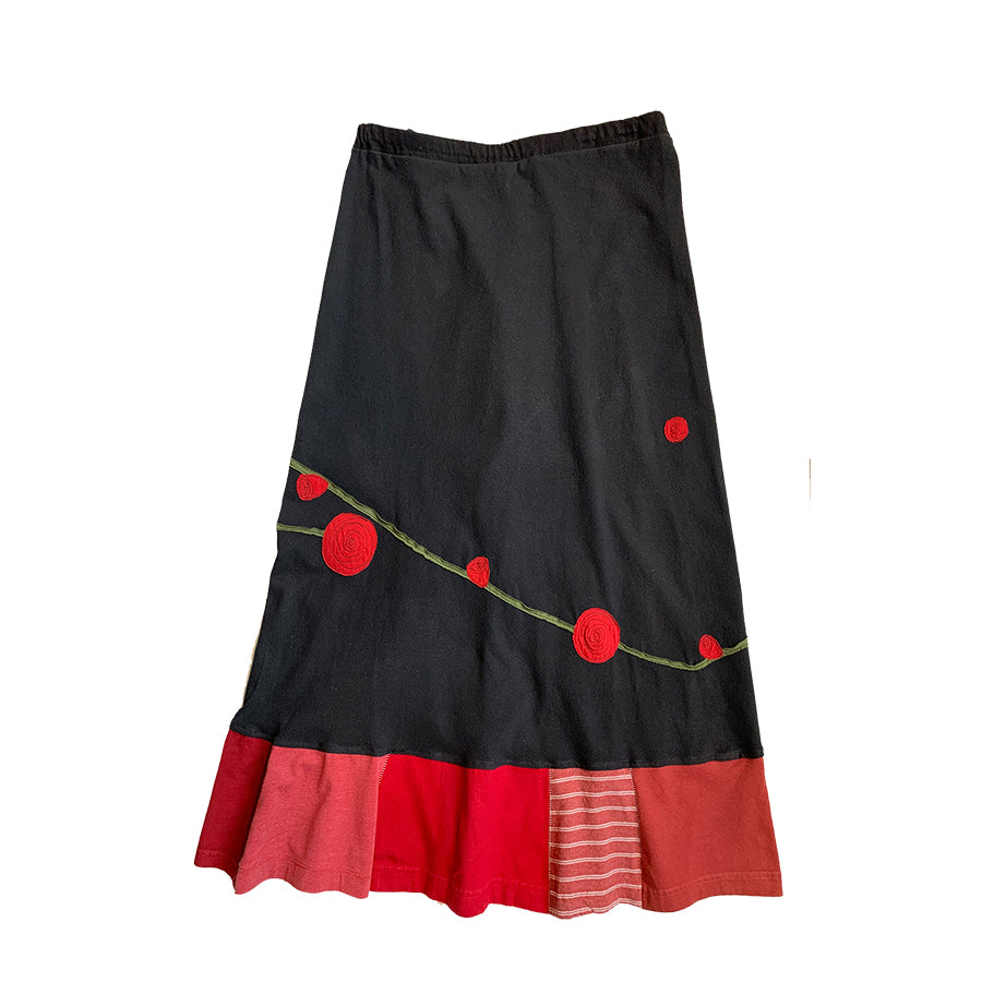 Long Skirts are made with high quality, up-cycled t-shirts. Freestyle sewn images are appliquéd on panels of various colors making each skirt unique and interesting.