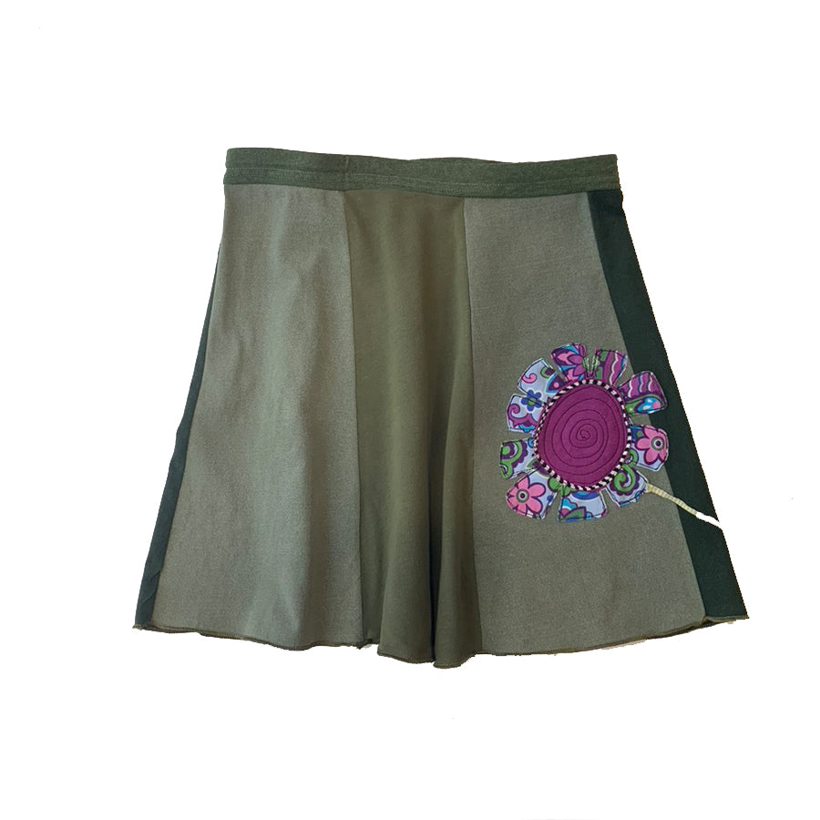 Mini skirts are made with high quality, up-cycled t-shirts. Freestyle sewn images are appliquéd on panels of various colors making each skirt unique and interesting.