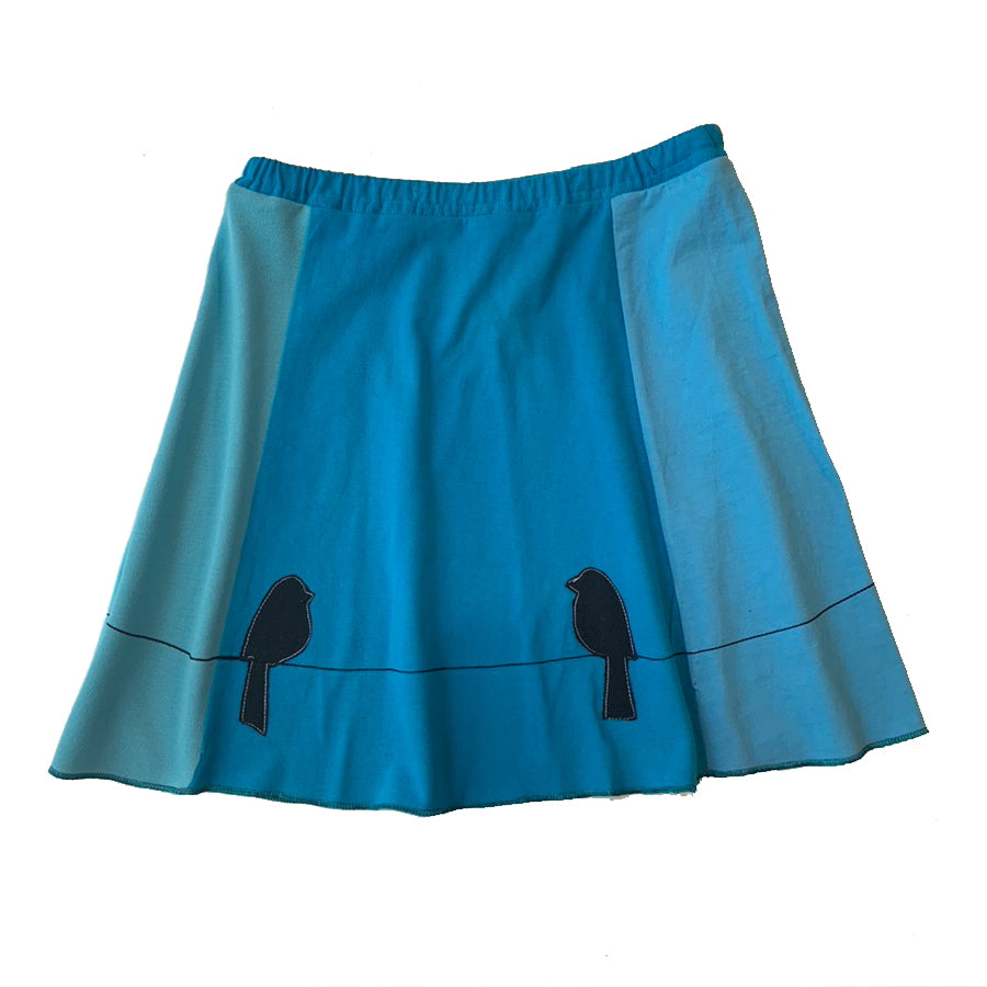 Mini skirts are made with high quality, up-cycled t-shirts. Freestyle sewn images are appliquéd on panels of various colors making each skirt unique and interesting.