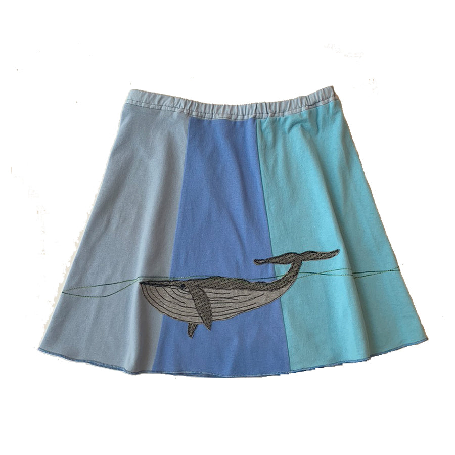 Mini skirts are made with high quality, up-cycled t-shirts. Freestyle sewn images are appliquéd on panels of various colors making each skirt unique and interesting.
