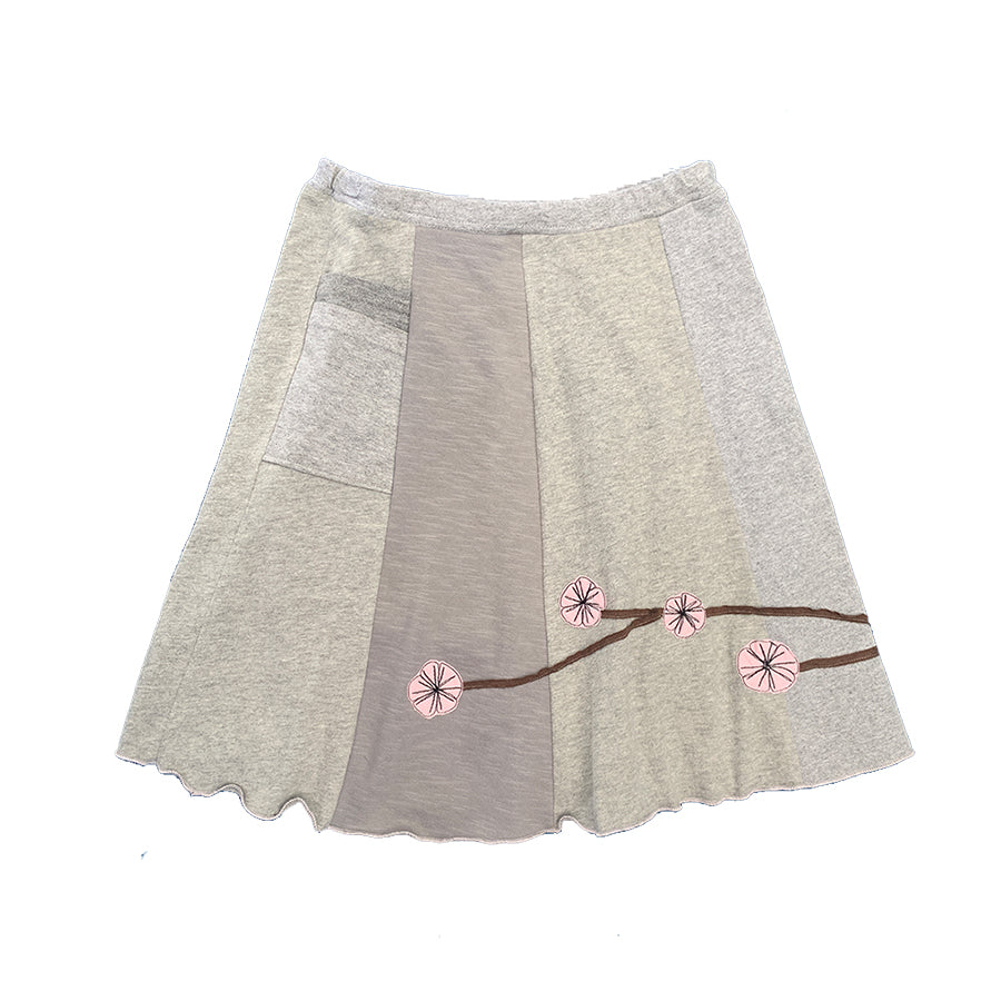 Mini skirts are made with high quality, up-cycled t-shirts. Freestyle sewn images are appliquéd on panels of various colors making each skirt unique and interesting.