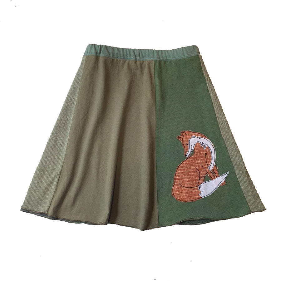 Mini skirts are made with high quality, up-cycled t-shirts. Freestyle sewn images are appliquéd on panels of various colors making each skirt unique and interesting.