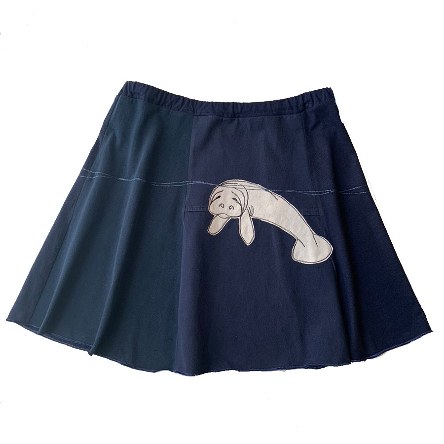 Mini skirts are made with high quality, up-cycled t-shirts. Freestyle sewn images are appliquéd on panels of various colors making each skirt unique and interesting.