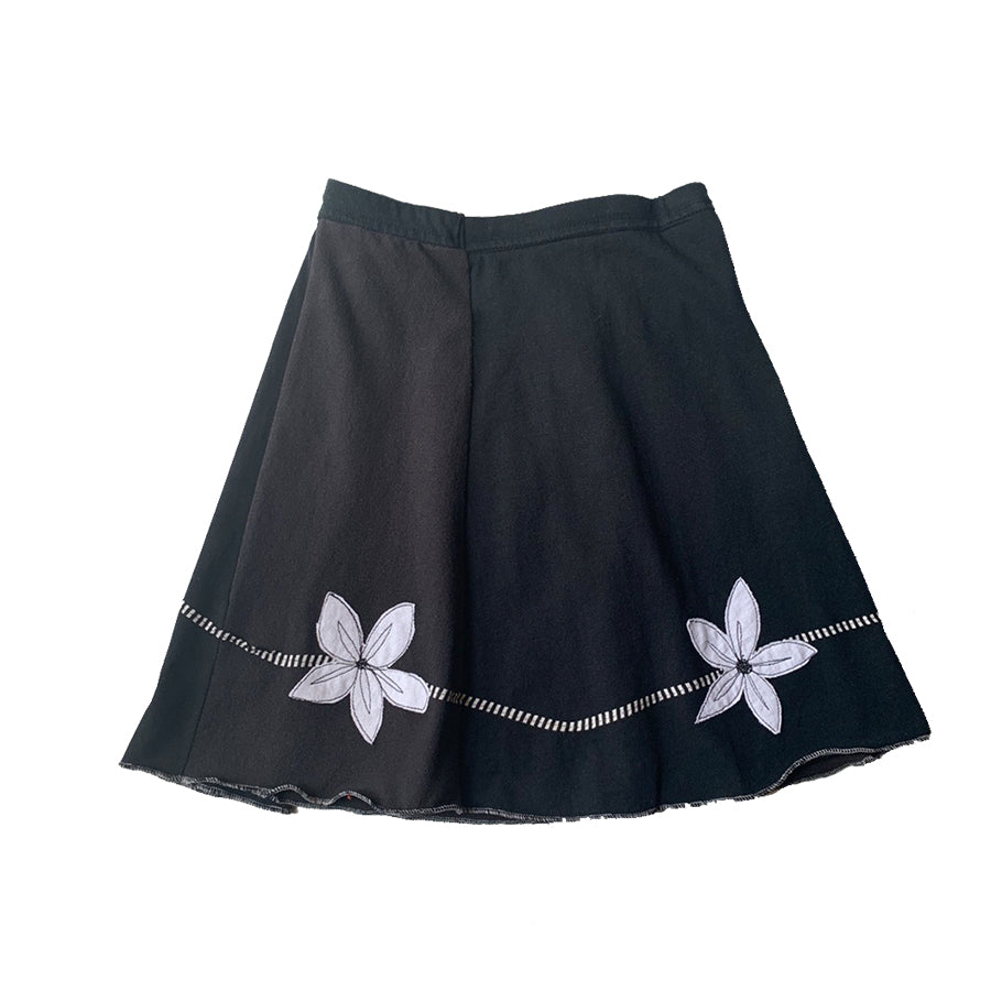 Mini skirts are made with high quality, up-cycled t-shirts. Freestyle sewn images are appliquéd on panels of various colors making each skirt unique and interesting.
