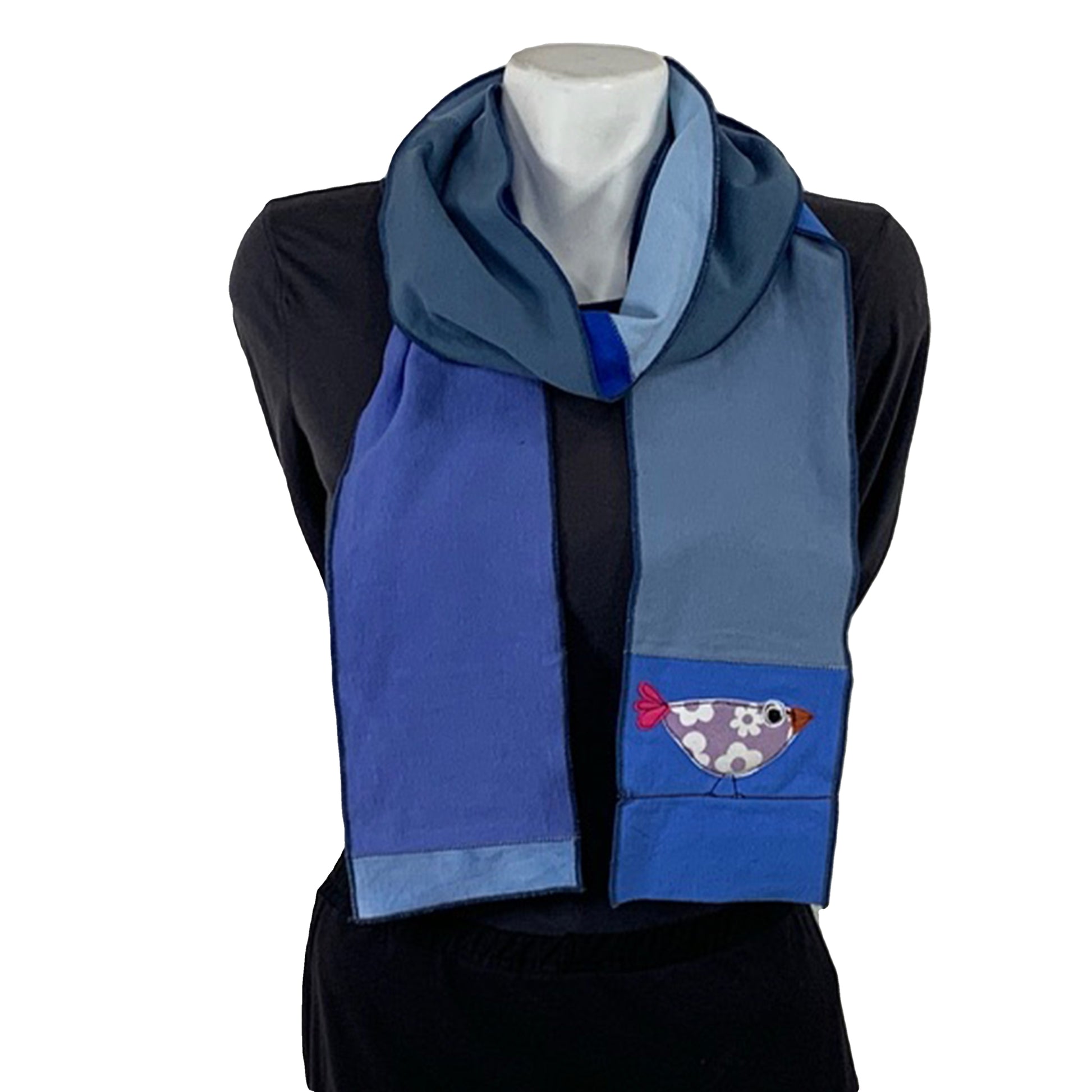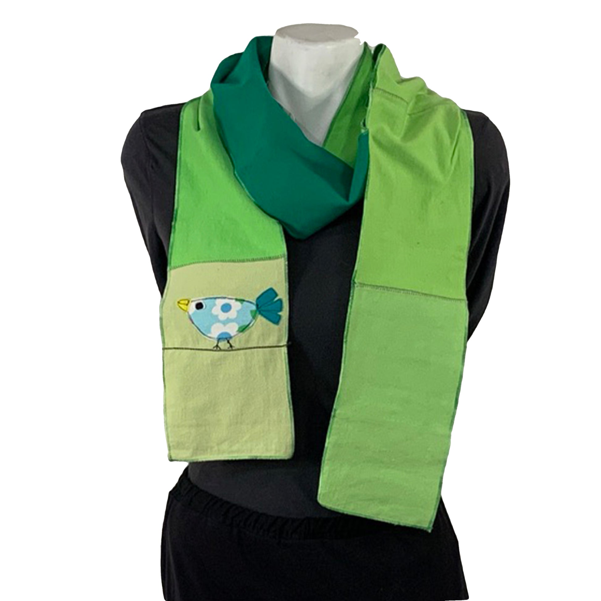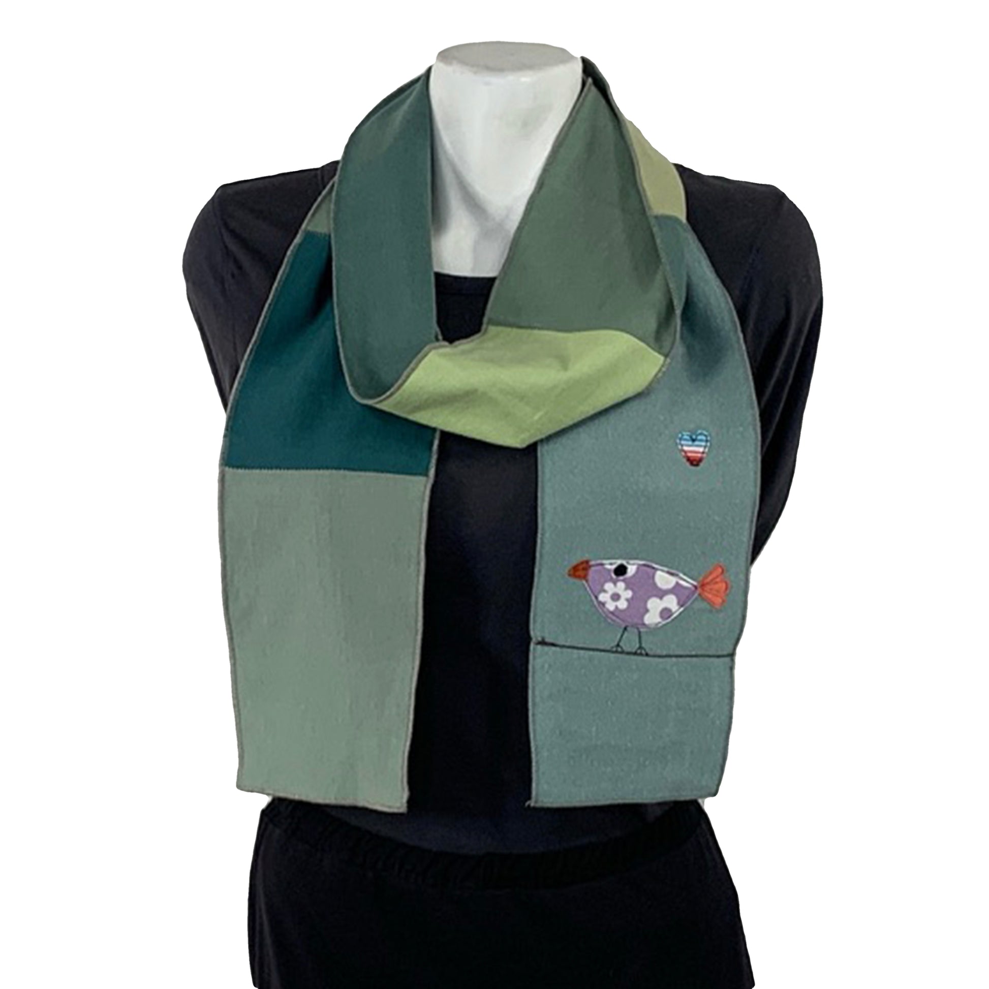 appliquéd scarves are made from 100% recycled and double paneled cotton t-shirts. The roughly 48" inch length allows you wrap the scarves once or twice and still show off the unique appliquéd image. The soft nature of cotton and unique images make these scarves a great way brighten up any outfit!