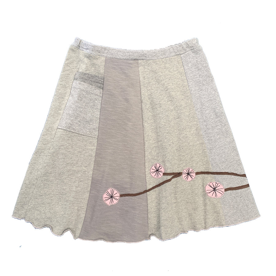 Classic Appliqué skirts are made with high quality, up-cycled t-shirts. Freestyle sewn images are appliquéd on panels of various colors making each skirt unique and interesting. Each skirt has a convenient pocket. Since there is no real “front” or “back”of this skirt, simply place the pocket where you like.