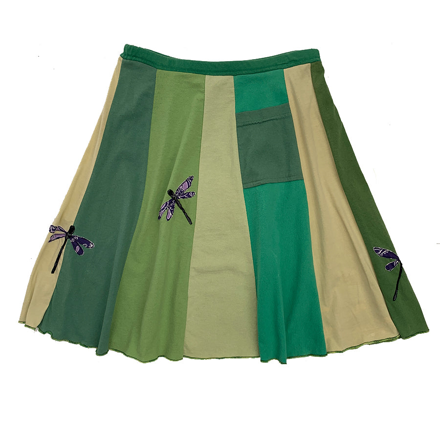 Classic Appliqué skirts are made with high quality, up-cycled t-shirts. Freestyle sewn images are appliquéd on panels of various colors making each skirt unique and interesting. Each skirt has a convenient pocket. Since there is no real “front” or “back”of this skirt, simply place the pocket where you like.