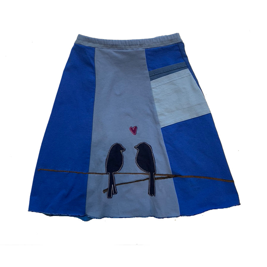 Classic Appliqué skirts are made with high quality, up-cycled t-shirts. Freestyle sewn images are appliquéd on panels of various colors making each skirt unique and interesting. Each skirt has a convenient pocket. Since there is no real “front” or “back”of this skirt, simply place the pocket where you like.