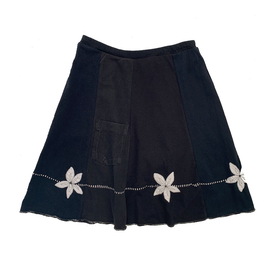 Classic Appliqué skirts are made with high quality, up-cycled t-shirts. Freestyle sewn images are appliquéd on panels of various colors making each skirt unique and interesting. Each skirt has a convenient pocket. Since there is no real “front” or “back”of this skirt, simply place the pocket where you like.