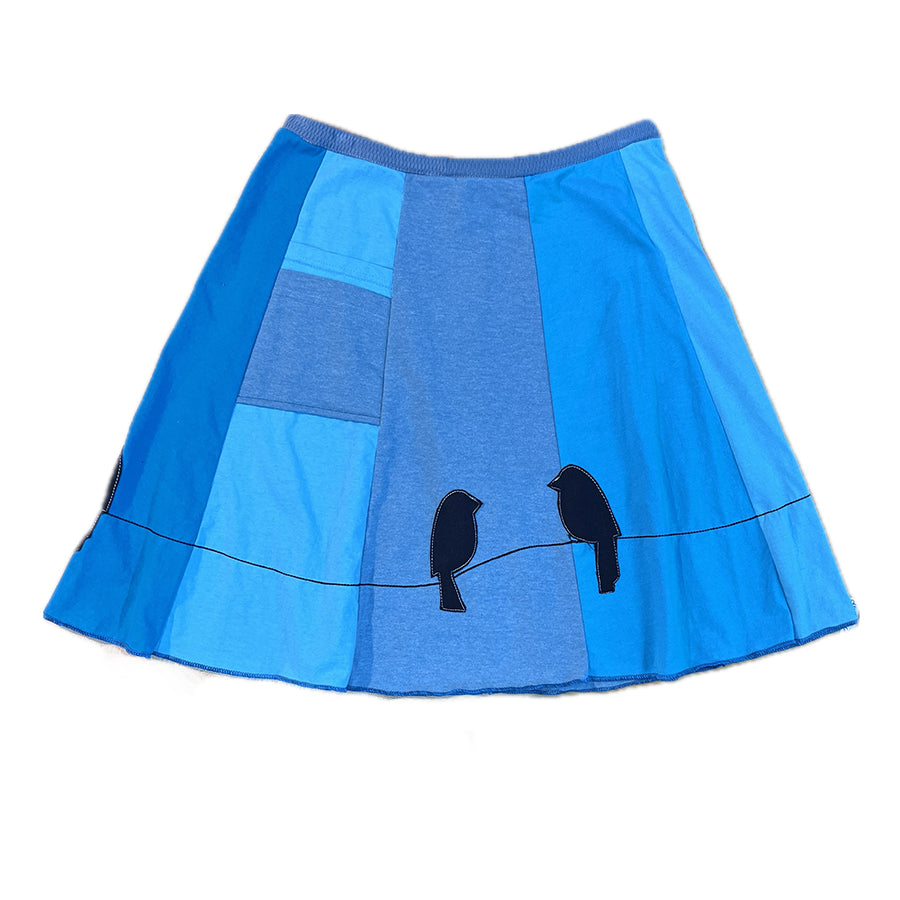 Classic Appliqué skirts are made with high quality, up-cycled t-shirts. Freestyle sewn images are appliquéd on panels of various colors making each skirt unique and interesting. Each skirt has a convenient pocket. Since there is no real “front” or “back”of this skirt, simply place the pocket where you like.