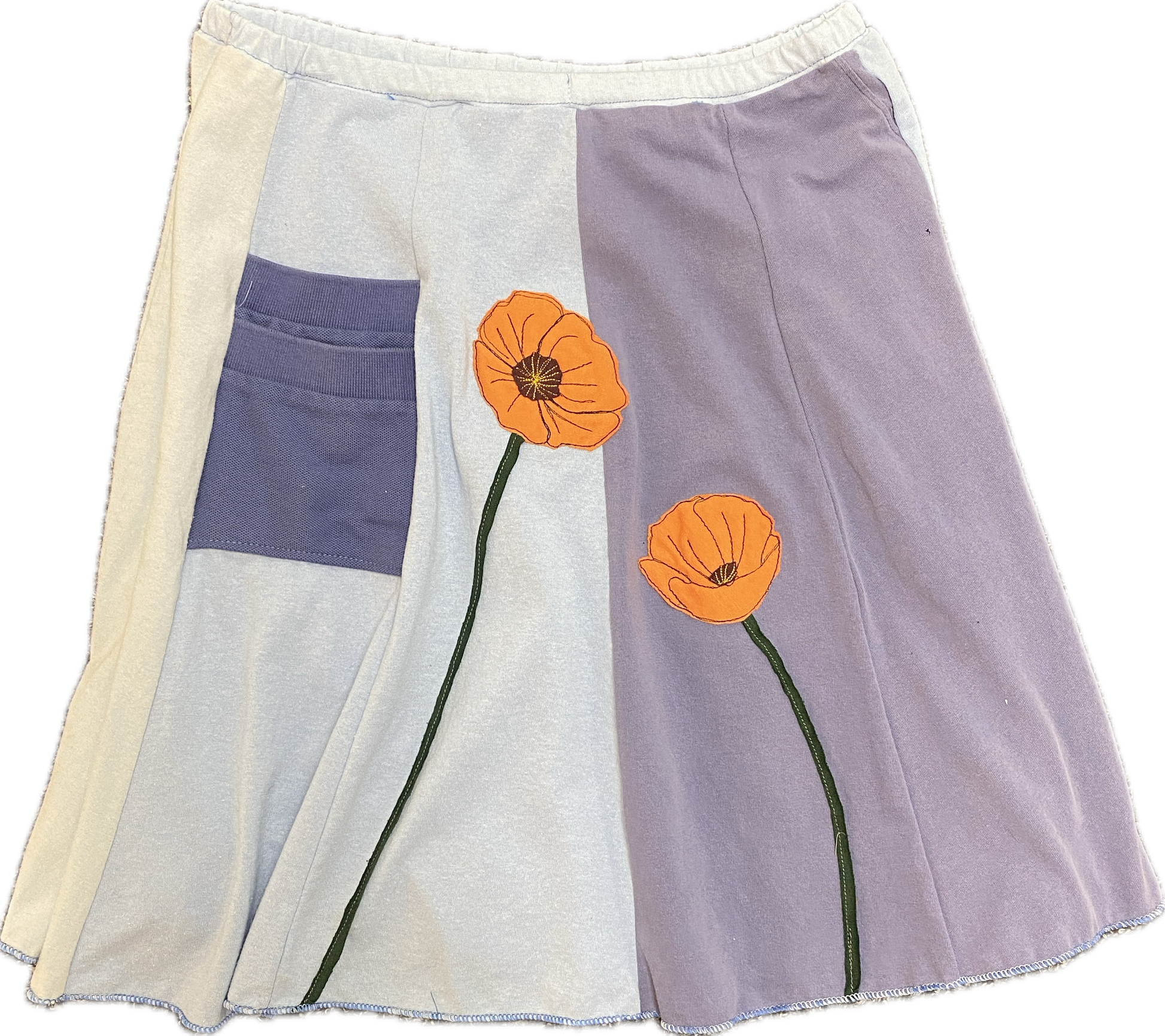 Classic Appliqué skirts are made with high quality, up-cycled t-shirts. Freestyle sewn images are appliquéd on panels of various colors making each skirt unique and interesting. Each skirt has a convenient pocket. Since there is no real “front” or “back”of this skirt, simply place the pocket where you like.