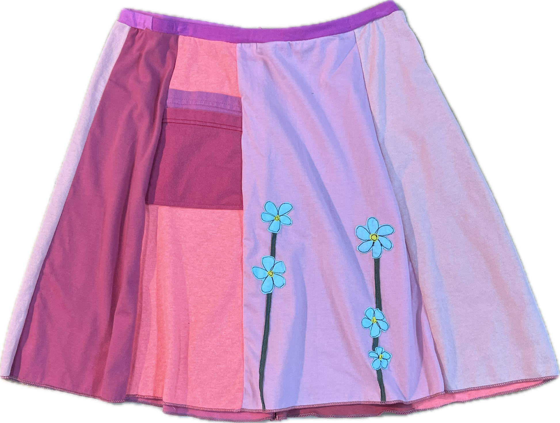 Classic Appliqué skirts are made with high quality, up-cycled t-shirts. Freestyle sewn images are appliquéd on panels of various colors making each skirt unique and interesting. Each skirt has a convenient pocket. Since there is no real “front” or “back”of this skirt, simply place the pocket where you like.