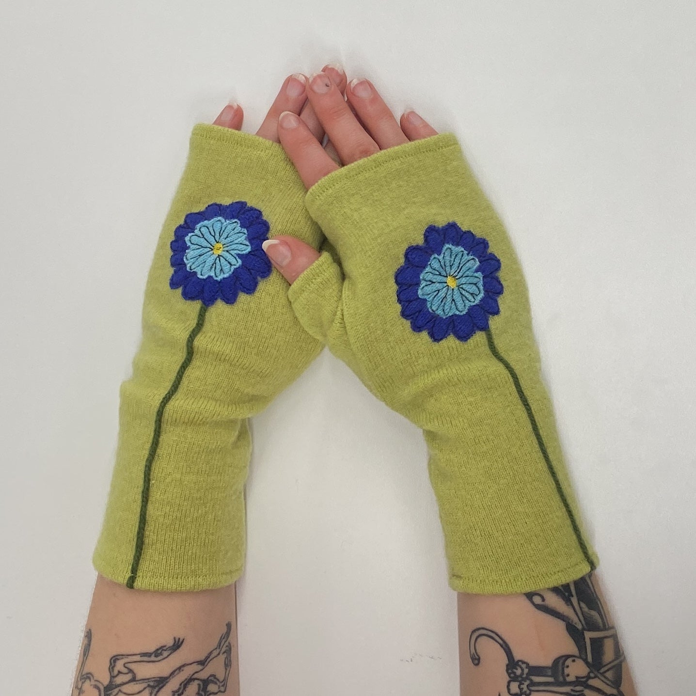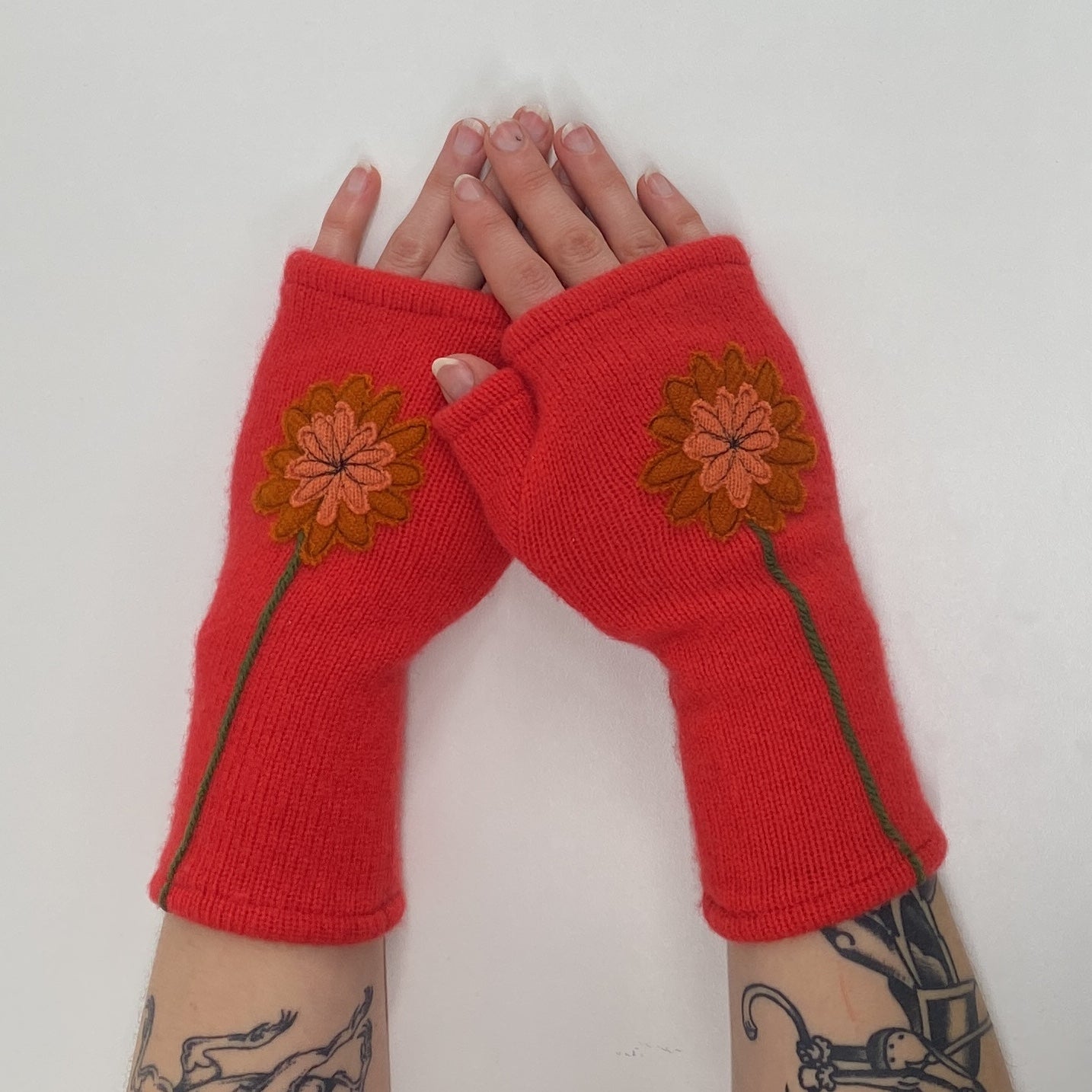 These are beautifully warm cashmere fingerless gloves. All gloves are individually made from super soft, lightly felted recycled cashmere and freestyle appliquéd so each pair is one of a kind.