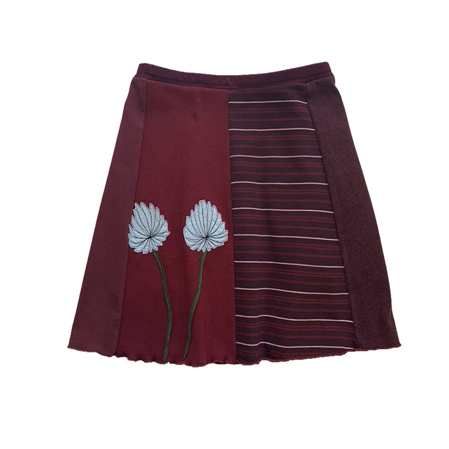 Mini skirts are made with high quality, up-cycled t-shirts. Freestyle sewn images are appliquéd on panels of various colors making each skirt unique and interesting.