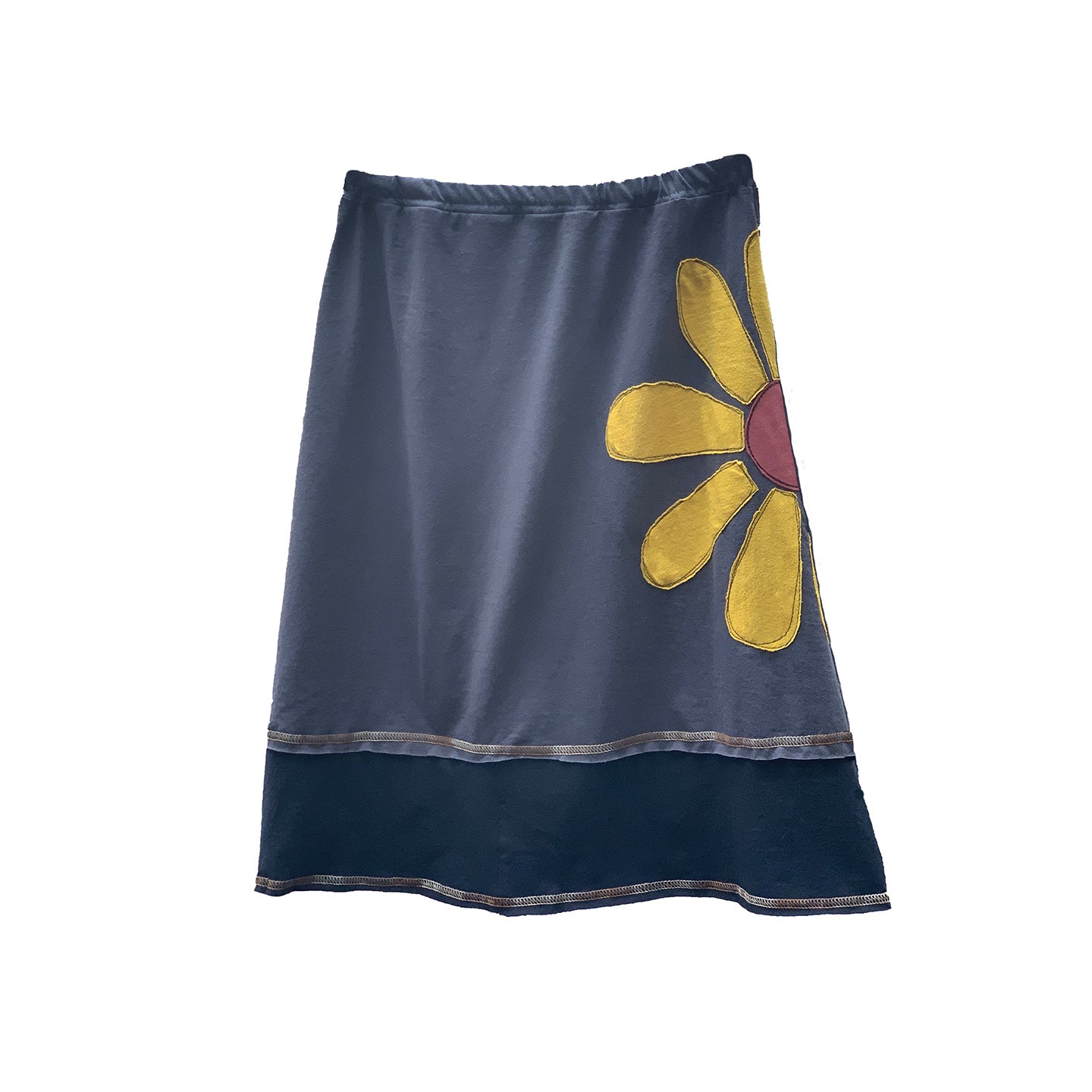 The Geometric Pattern Skirts are made with high quality, up-cycled t-shirts. Each skirt has a solid colored top layer featuring a statement geometric appliquéd image and is finished with a 5" complimentary bottom trim layer. The 23" overall length hits at the knee making this a classic for the office yet super soft and comfortable enough for the weekends!