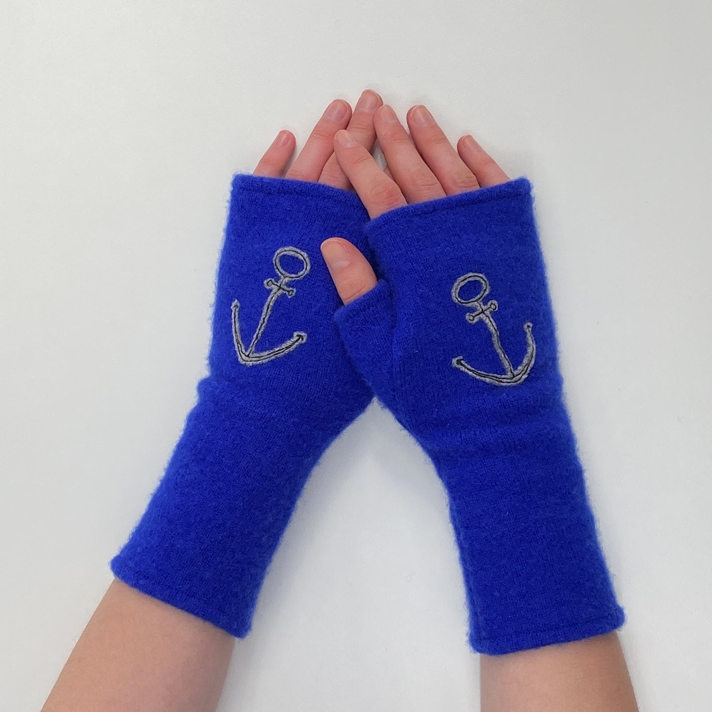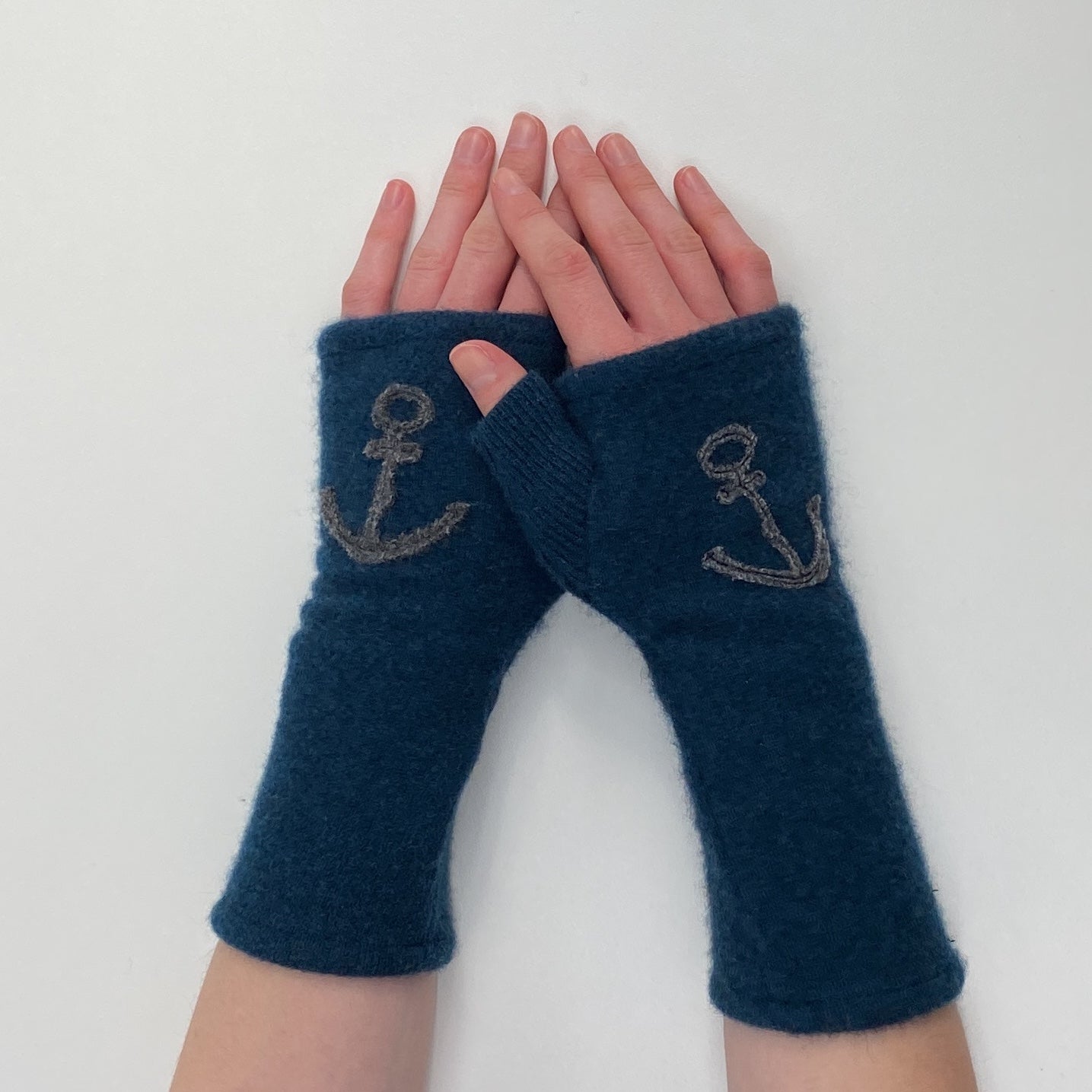These are beautifully warm cashmere fingerless gloves. All gloves are individually made from super soft, lightly felted recycled cashmere and freestyle appliquéd so each pair is one of a kind.