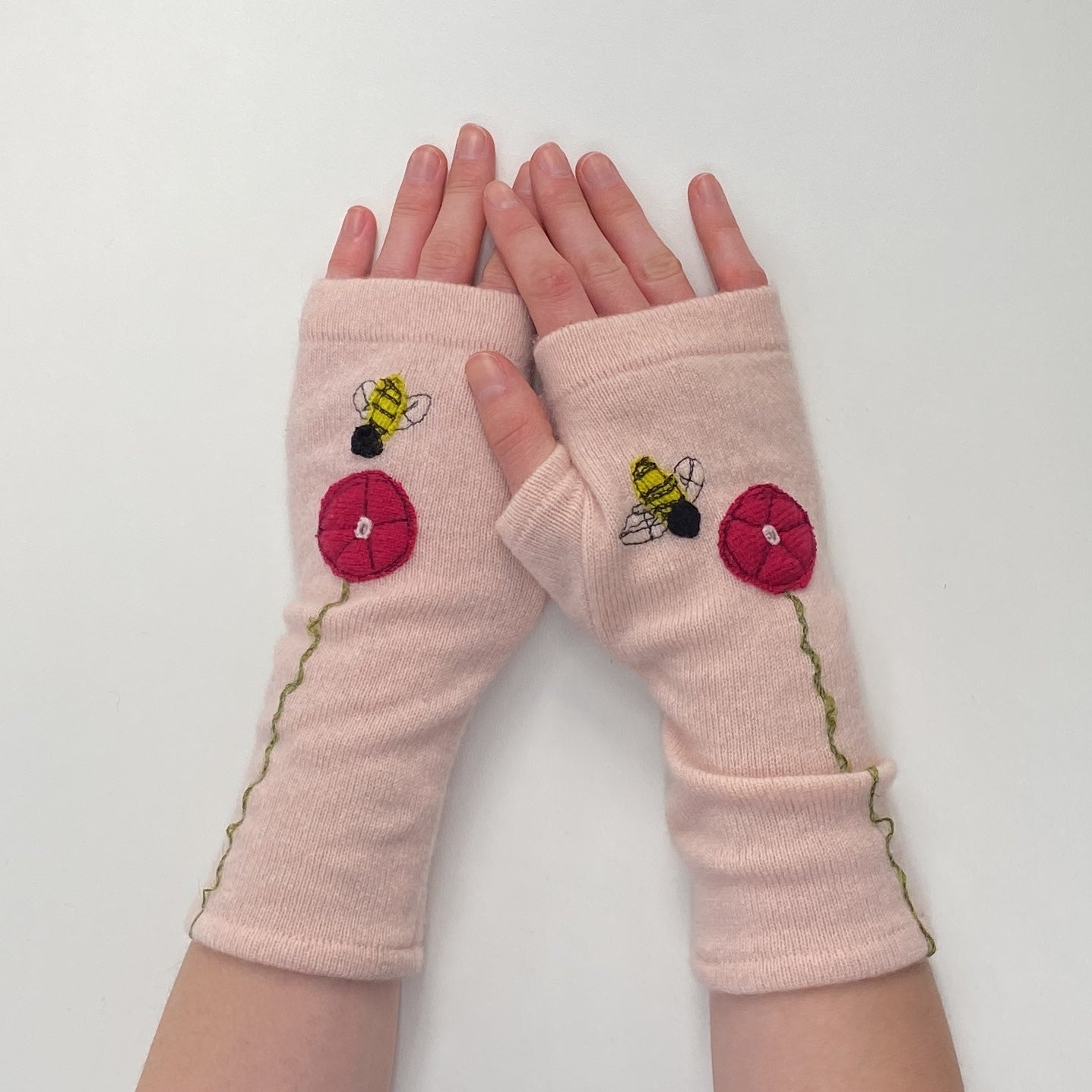 These are beautifully warm cashmere fingerless gloves. All gloves are individually made from super soft, lightly felted recycled cashmere and freestyle appliquéd so each pair is one of a kind.