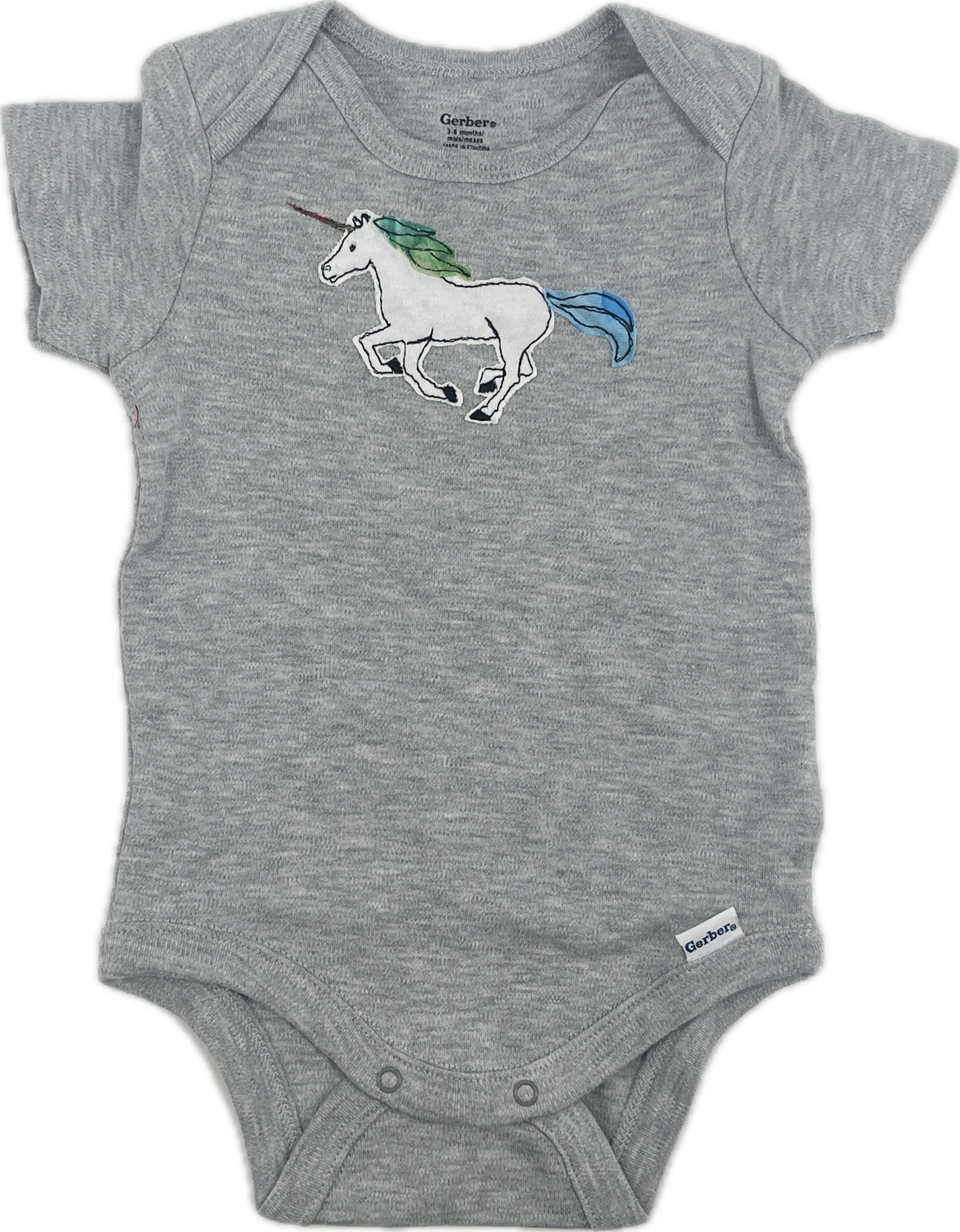 Have you been searching for a one of a kind onesie? This unicorn onesie fits the bill for sure! This short sleeve onesie is made from 100% cotton with a magical unicorn trotting across the front !