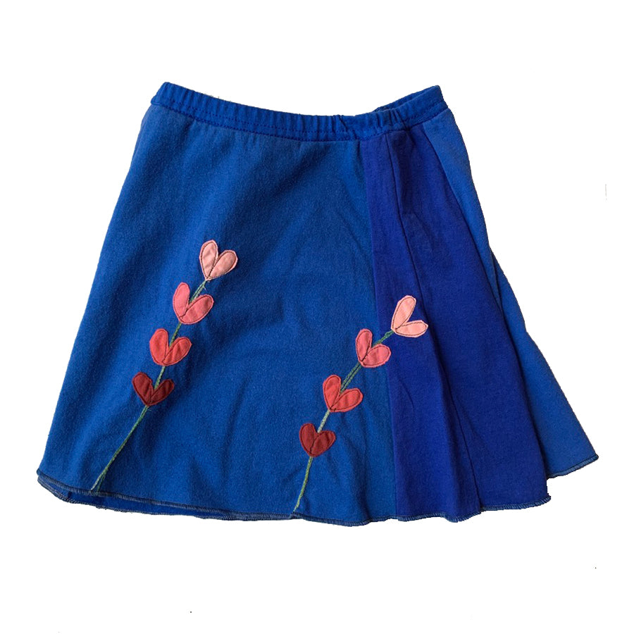Kids skirts are made with high quality, up-cycled t-shirts. Freestyle sewn images are appliquéd on panels of various colors making each skirt unique and interesting.