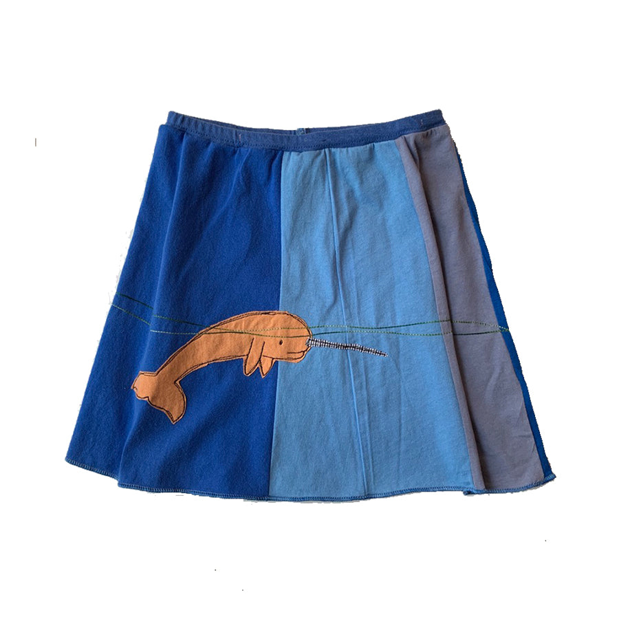 Kids skirts are made with high quality, up-cycled t-shirts. Freestyle sewn images are appliquéd on panels of various colors making each skirt unique and interesting.