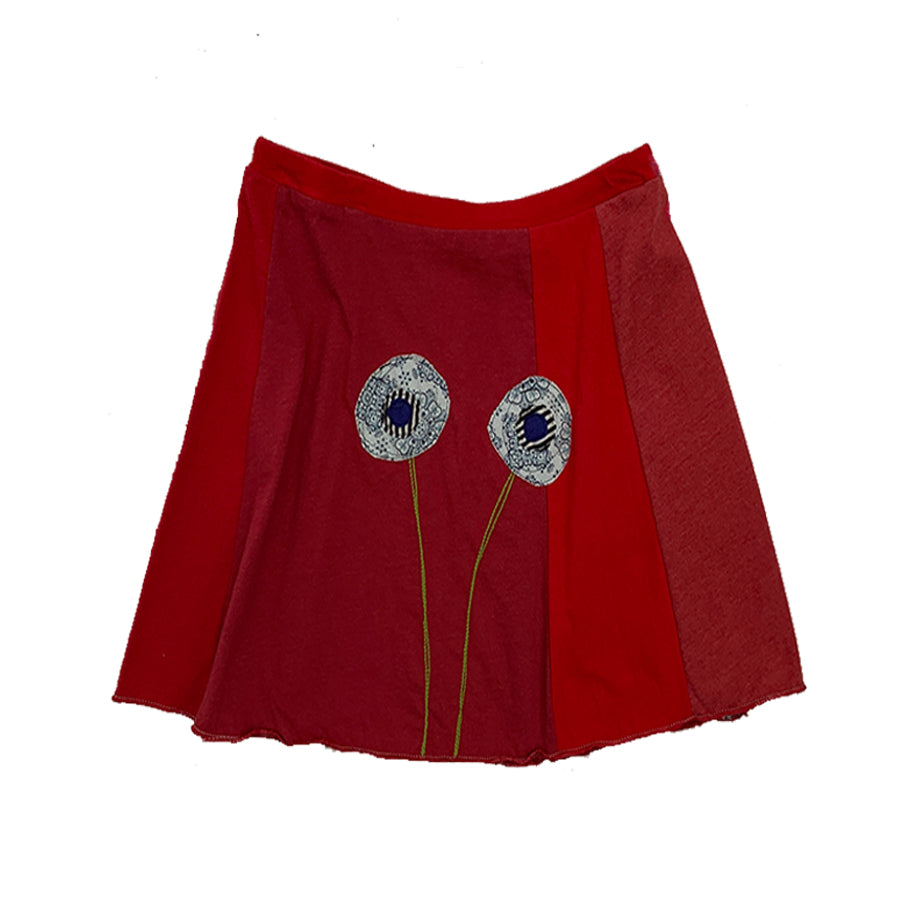 Kids skirts are made with high quality, up-cycled t-shirts. Freestyle sewn images are appliquéd on panels of various colors making each skirt unique and interesting.