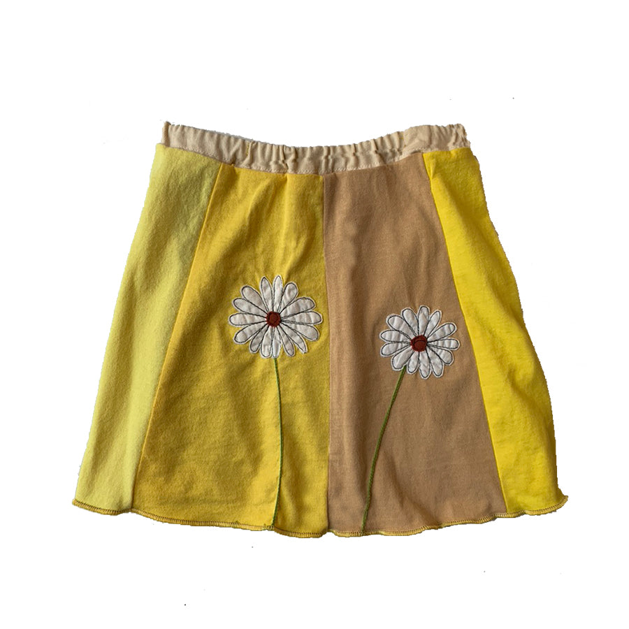 Kids skirts are made with high quality, up-cycled t-shirts. Freestyle sewn images are appliquéd on panels of various colors making each skirt unique and interesting.