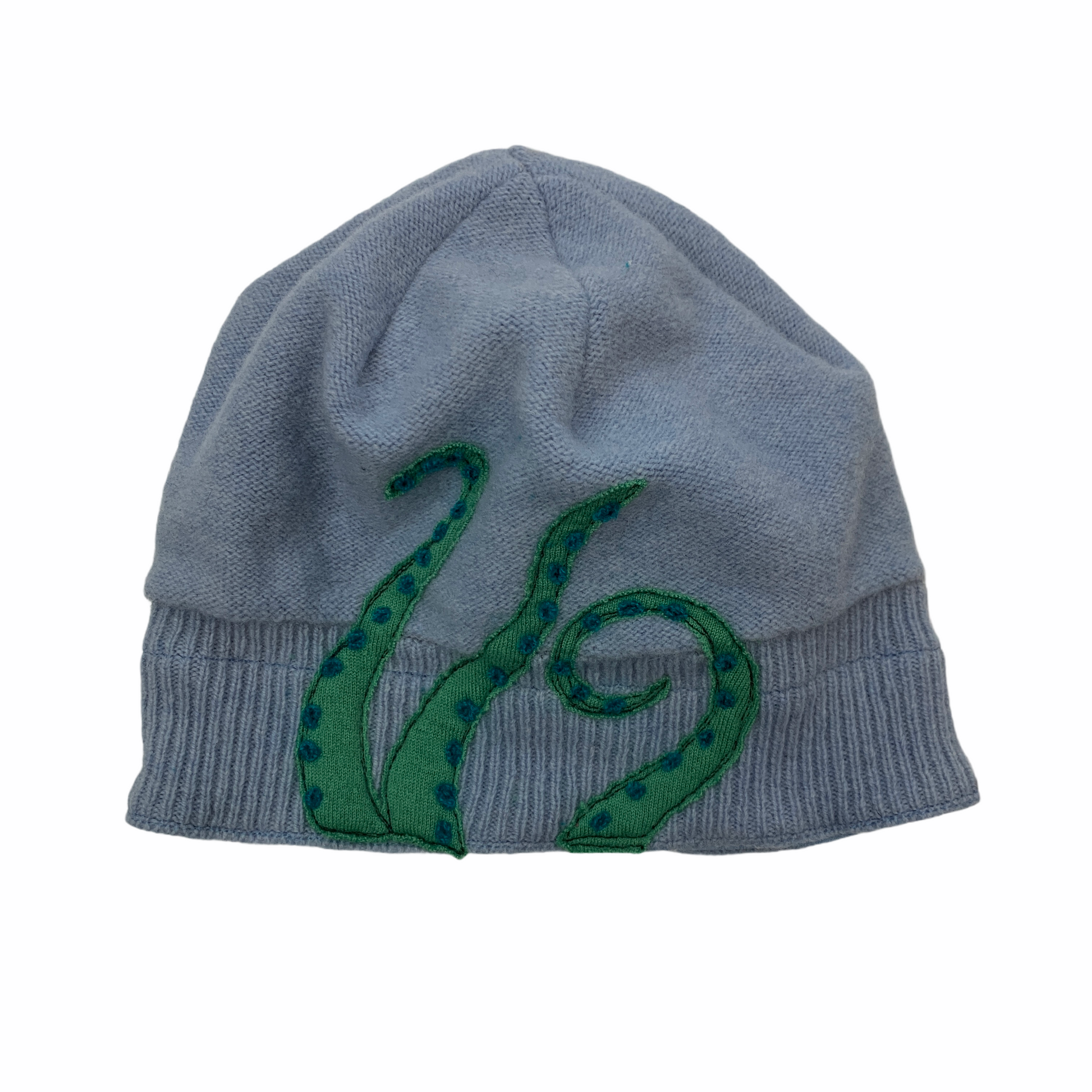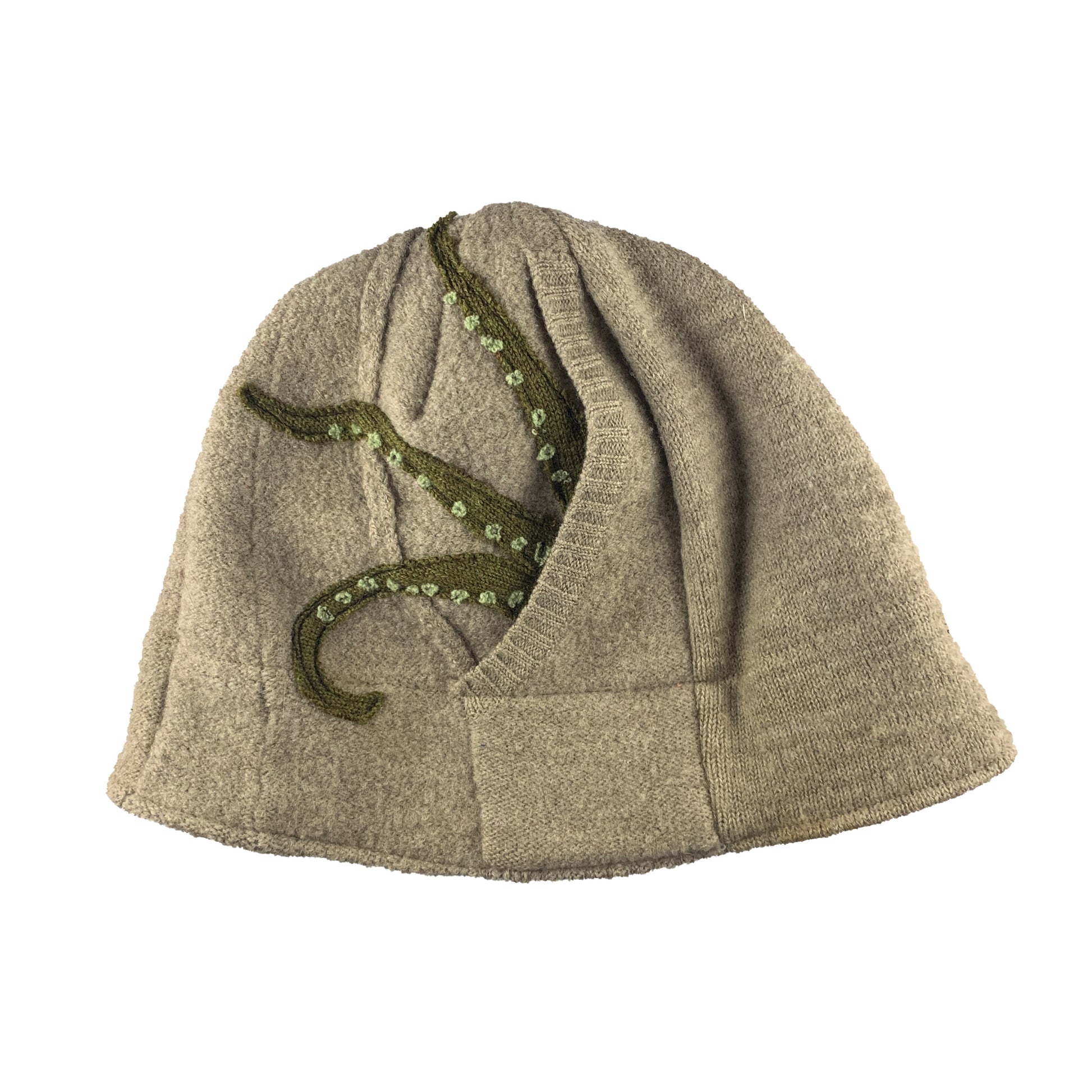 Our felted wool hats are individually made from recycled felted, wool sweaters. Each hat is lined with a coordinating jersey knit. Playful images are free style sewn making each hat one of a kind!