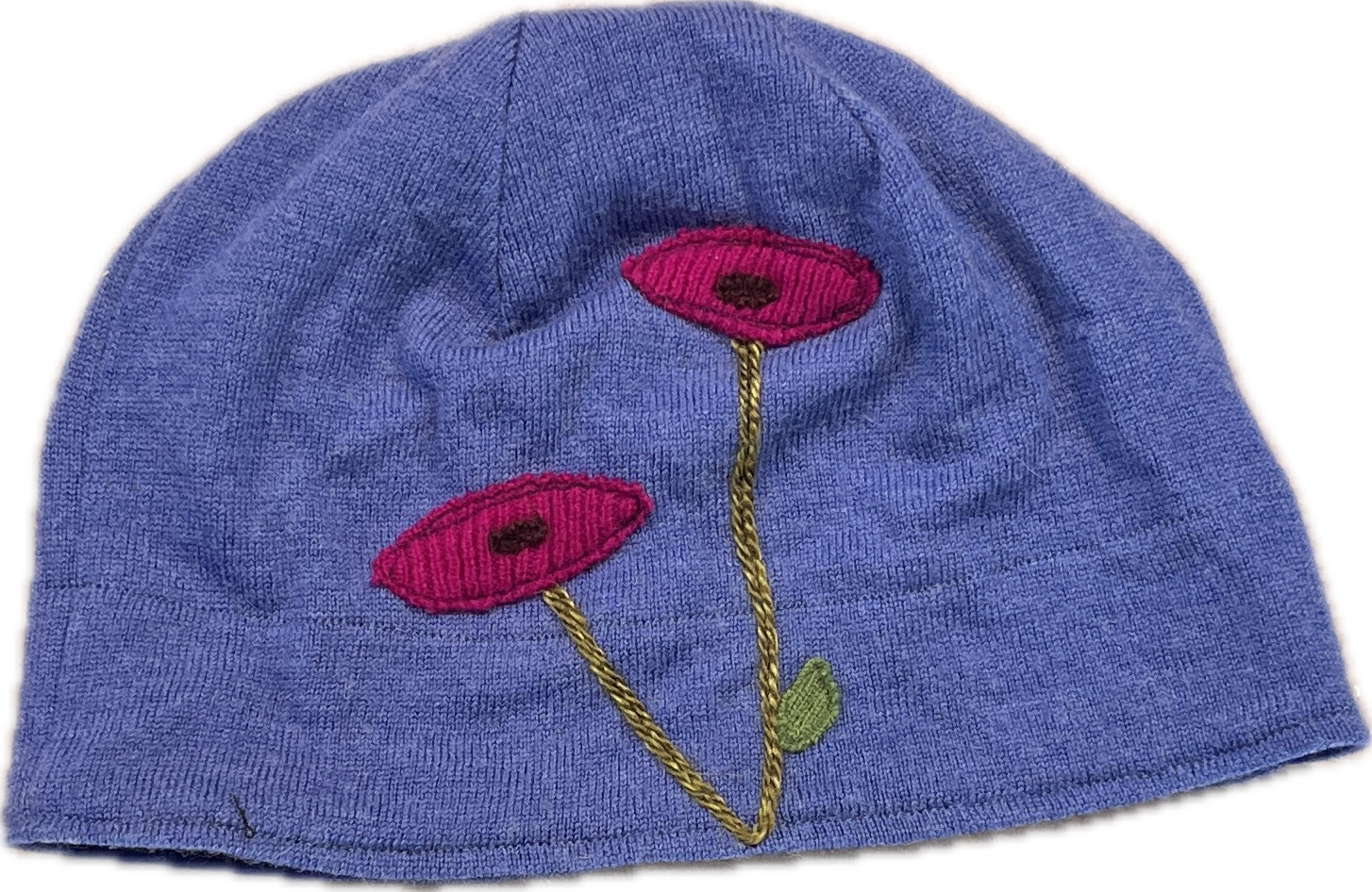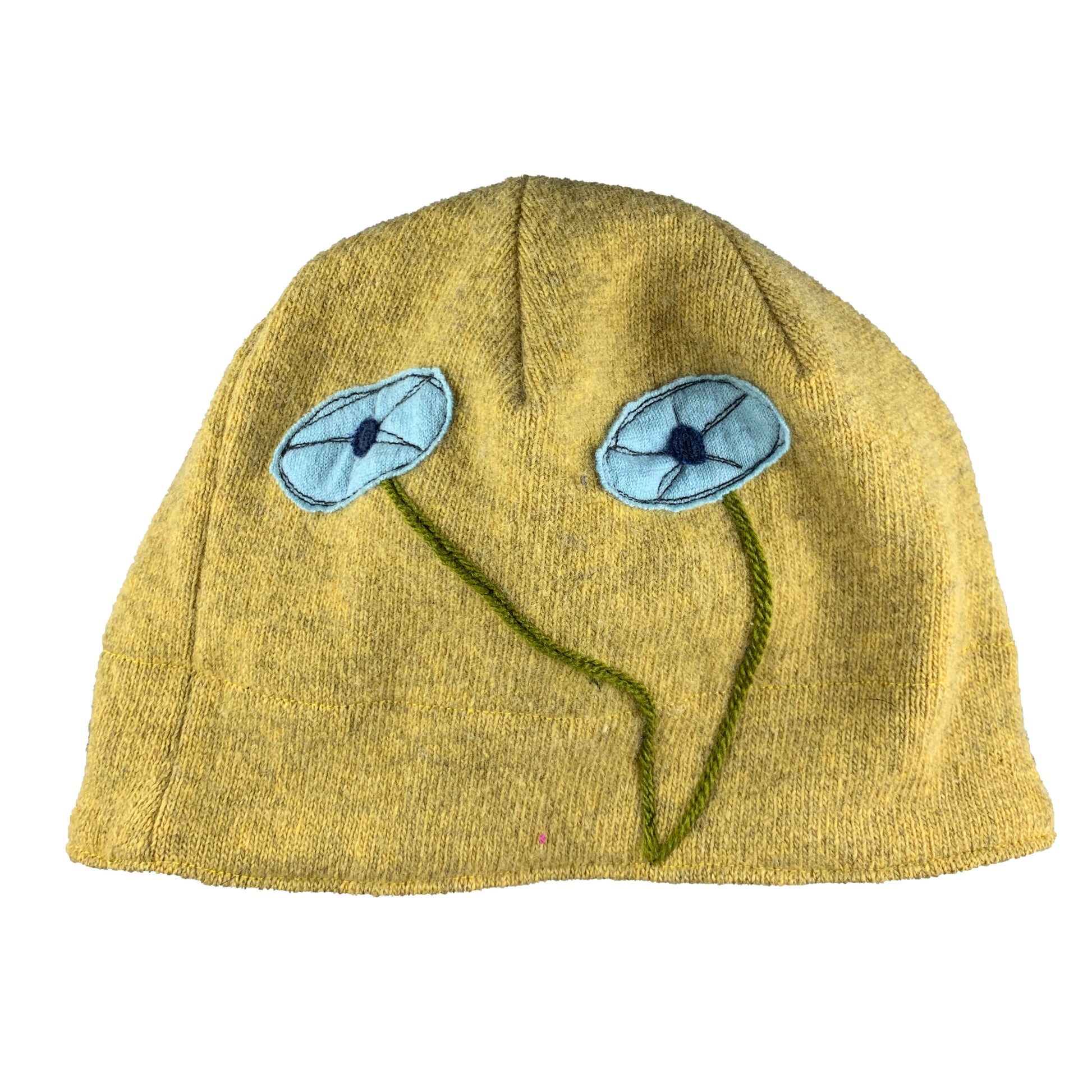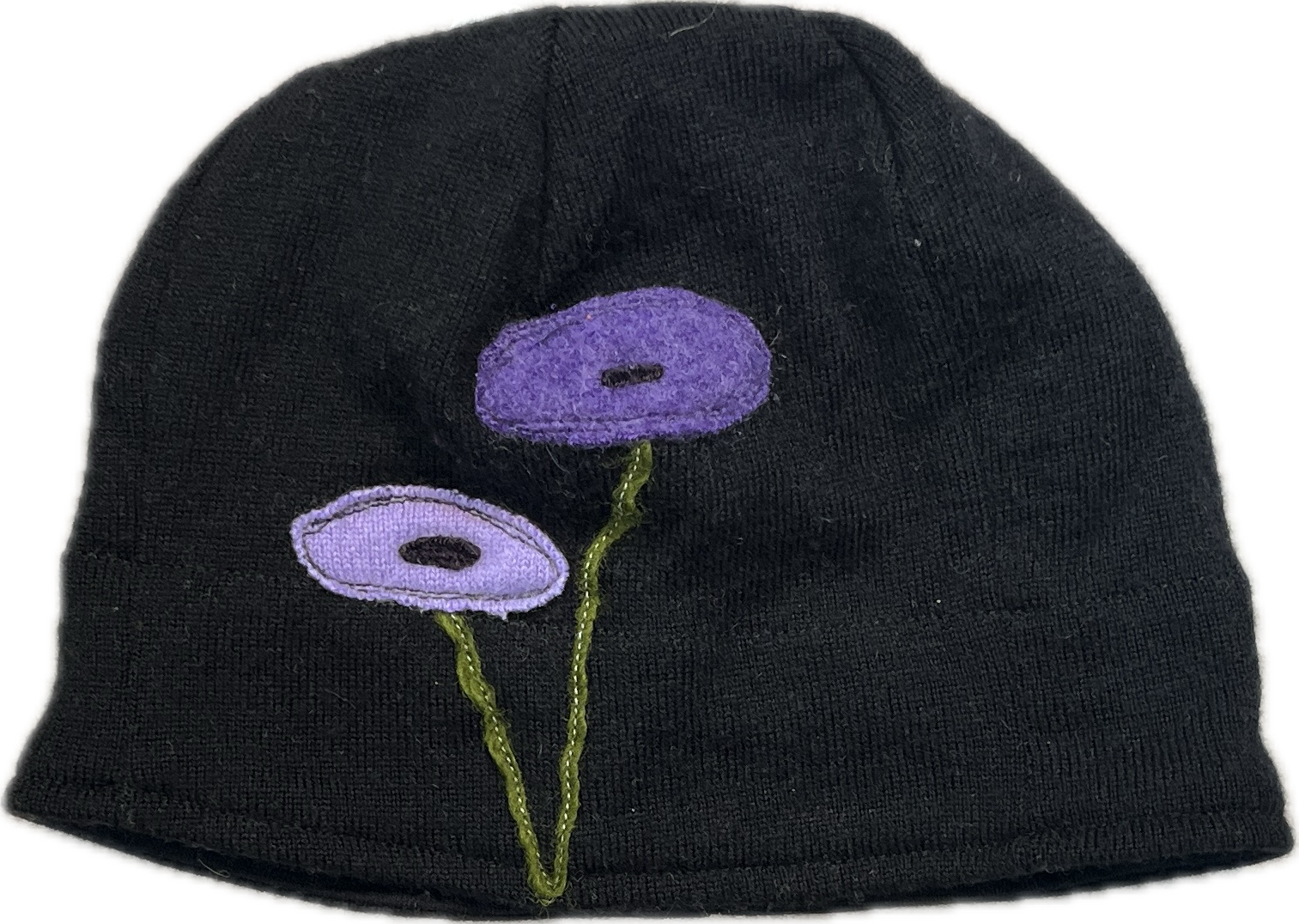 Our felted wool hats are individually made from recycled felted, wool sweaters. Each hat is lined with a coordinating jersey knit. Playful images are free style sewn making each hat one of a kind!