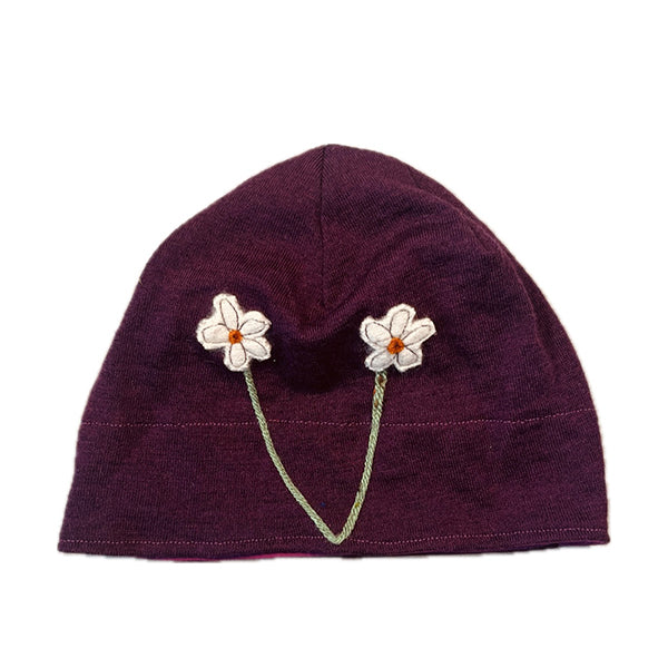 Our felted wool hats are individually made from recycled felted, wool sweaters. Each hat is lined with a coordinating jersey knit. Playful images are free style sewn making each hat one of a kind!